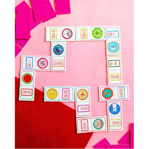 В наборе 28 фишек и простые правила (на упаковке). Играют 2-4 участника. Задача - соединять фишки, на которых часы показывают одинаковое время. Подсказка: одинаковое время обозначено рамочками одного цвета.