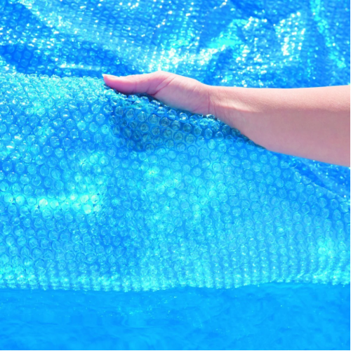 Солнечный тент предотвращает попадание грязи на поверхность воды и уменьшает ее испарение, однако, благодаря использованию прозрачной пленки (голубоватого оттенка) и ячеистой структуре, он не препятствует отражению солнечных лучей от поверхности воды и позволяет воде прогреться быстрее.