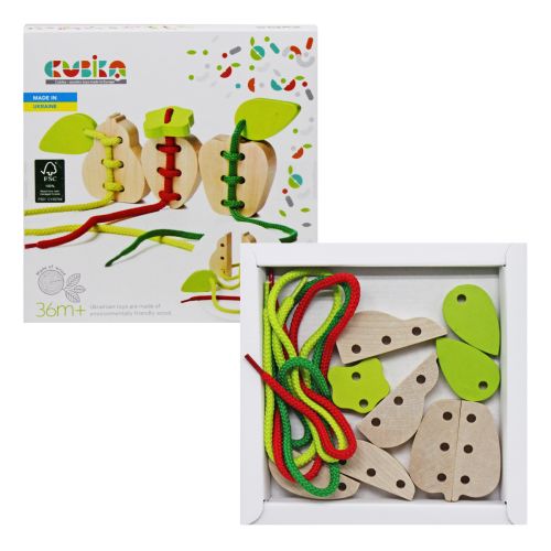 Развивающая игрушка из натурального дерева. Ребенку предстоит правильно связать шнурочком деревянные половинки фруктов. Шнуровки развивают мелкую моторику рук, формируют навыки шнурования, и завязывания шнурка в бант, пространственное ориентирование, сенсомоторную координацию.