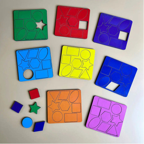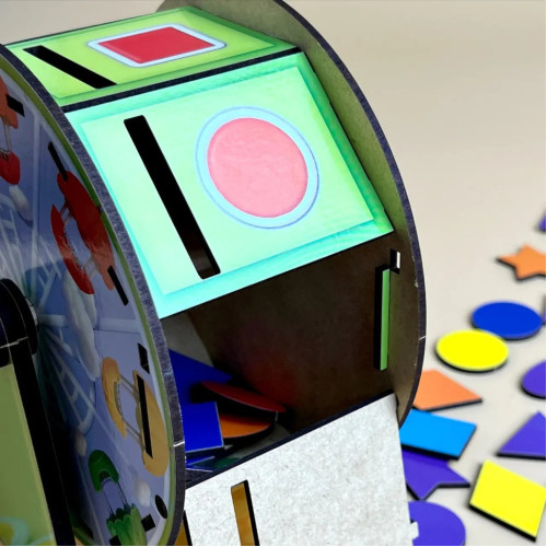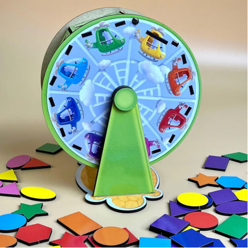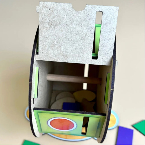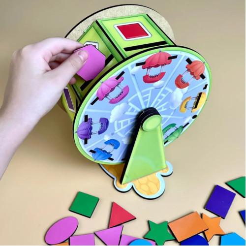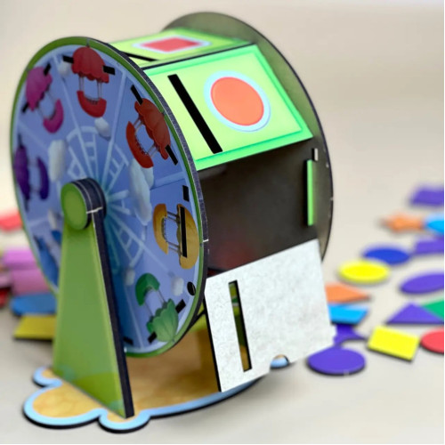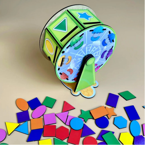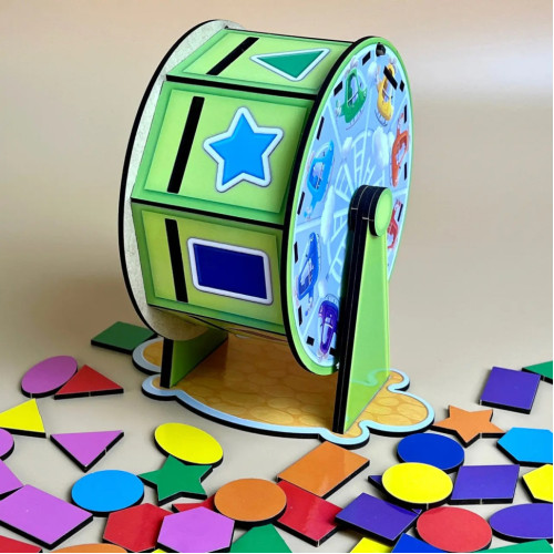 В этом наборе Вы найдете 64 сортировочные плашки с разноцветными геометрическими фигурами. Задача ребенка: правильно все рассортировать, поворачивая барабан. Изучайте цвета, счет, геометрические фигуры. Трафареты из фигур можно использовать для рисования. Развивайтесь, весело играя!