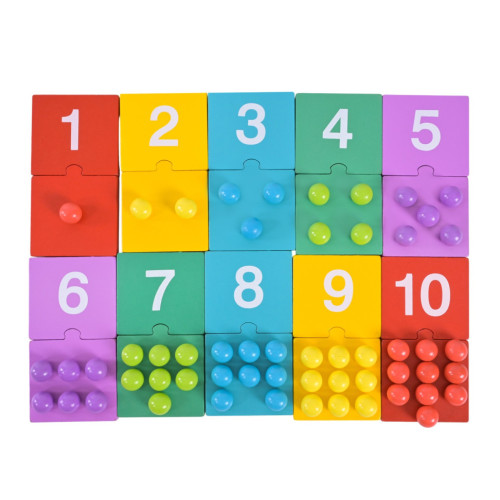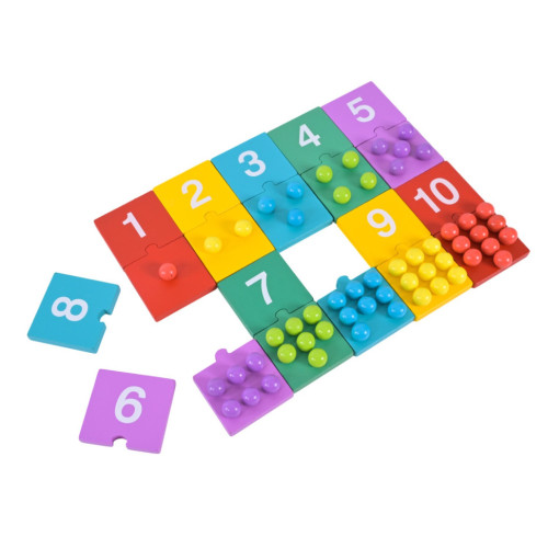 Возможны дополнительные элементы для сортировки (например, геометрические фигуры или колышки для нанизывания), что помогает визуально связать цифру с количеством.