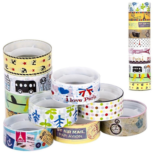 Набор из 10 рулонов декоративного скотча с рисунками. Каждый рулон имеет размеры 1,5 см на 2 м. Скотч изготовлен из ПВХ. Подходит для вклеивания фотографий, декорирования книг, комнат или упаковки подарков.