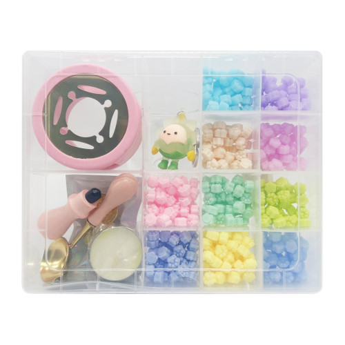 Все элементы удобно размещены в крепком пластиковом боксе, что обеспечивает порядок, легкое хранение и комфортную транспортировку. В комплект входит все необходимое для работы: парафиновая свеча для нагрева, ложечка для плавления воска, подставка для нагрева и металлическая печать с изящными сменными насадками, позволяющими создавать различные варианты отпечатков.