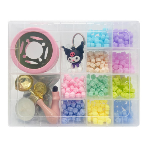 Все элементы удобно размещены в крепком пластиковом боксе, что обеспечивает порядок, легкое хранение и комфортную транспортировку. В комплект входит все необходимое для работы: парафиновая свеча для нагрева, ложечка для плавления воска, подставка для нагрева и металлическая печать с изящными сменными насадками, позволяющими создавать различные варианты отпечатков.