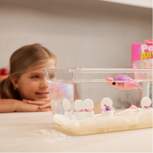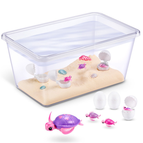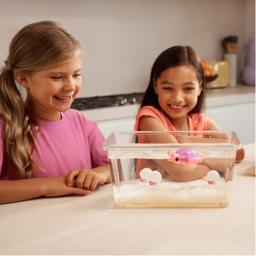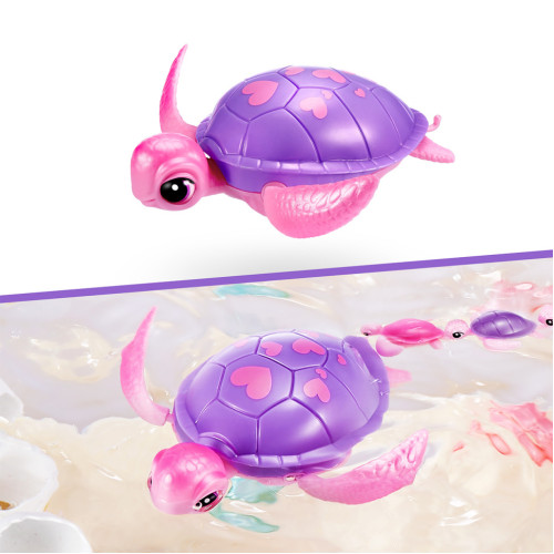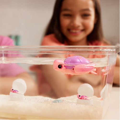 Поиграйте с мамой-черепахой и ее малышами! В «песочной» основе спрятались три яйца – налейте воду в аквариум, и они сами откроются! Сколько маленьких черепах появится на этот раз? Прикрепите их к маме – и вместе отправляйтесь в водное приключение!
