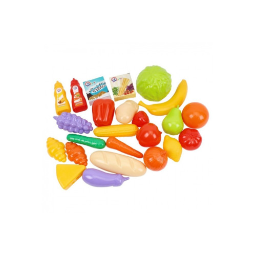 В наборе прилавок с полками для ящичков с разнообразными полезными и аппетитными игрушечными продуктами: от сочной клубники и спелых бананов до ароматного батона и сыра. В магазине большой ассортимент: круассаны, батон, сыр, капуста, картофель, кукуруза, огурец, помидор, морковь, перец, баклажан, лук, груша, яблоко, банан, виноград, лимон, апельсин, клубника. На прилавке есть тортовщица для презентации вкуснейших продуктов и дополнительные верхние полки для акционных товаров, две картонные коробочки со спагетти и хлопьями + 2 бутылочки с кетчупом и горчицей.