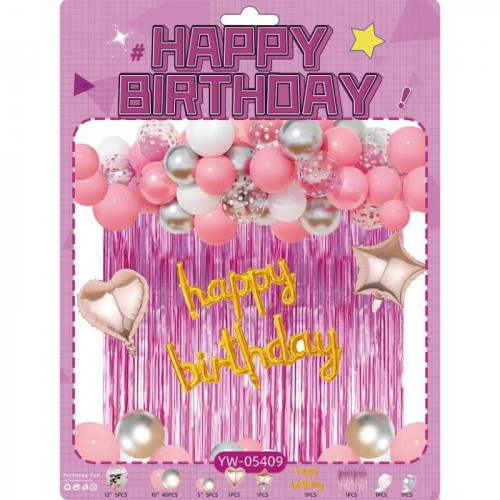 В комплект входят шары с блёстками диаметром 12" - 5 шт, шары розового и серебристого оттенков диаметром 10" - 40 шт и 5" - 5 шт, а также фольгированные фигуры: сердце - 1 шт и звезда - 1 шт Дополнительно в набор входят декоративная шторка-"дождик", надпись Happy Birthday, лента для крепления шаров и рулон клеевых точек.