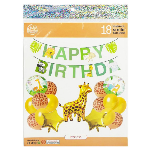 Набор воздушных шаров в стиле Сафари - идеальное решение для создания яркой и атмосферной фотозоны на детском празднике. Тематический дизайн с животными принтами и фигуркой жирафа поможет легко превратить любое помещение в настоящее приключение в дикой природе.