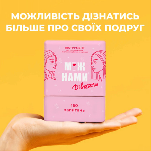 Наша гра дозволяє поділитися досвідом, надати цінні поради та створити приємні спогади зі своїми найкращими подругами. Розроблені спільно з психологом запитання допоможуть зміцнити відносини та знайти нові аспекти у спілкуванні зі своїми близькими. Наша гра – це можливість побудувати міцні довірливі стосунки з подругами та зруйнувати міф про те, що жіночої дружби не існує. Дозвольте собі насолоджуватися приємною компанією та емоціями, які не залишатимуть вас незмінними.