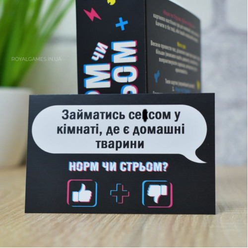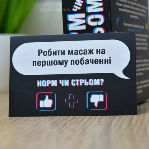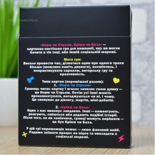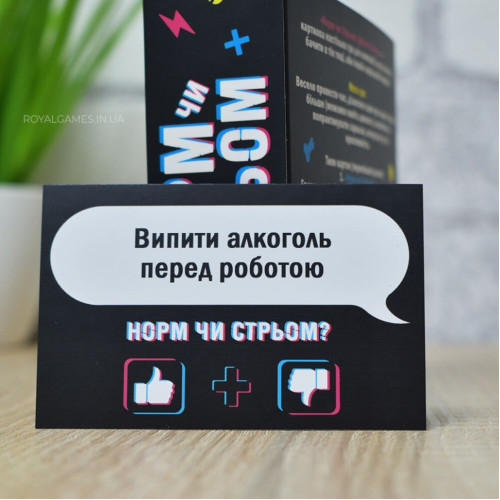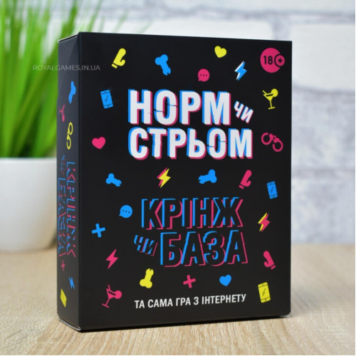 А ты уже почувствовал на себе трендовую игру для компании - "Норм или Стрем, Кринж или База"? Это очень свежее издание от Украинского производителя, игра стремительно набирает обороты, довольно популярно в Тик-токе. Цель игры это весело провести время, узнать друг друга немного больше (возможно, и странного), посмеяться, и попрактиковать сарказм, актерскую игру и креативность.