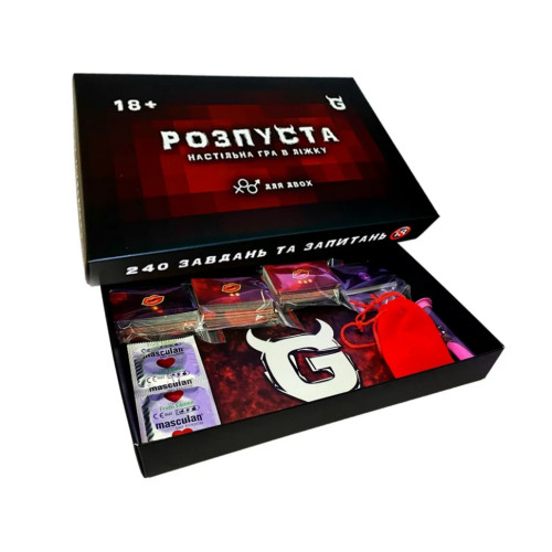 Комплектация: Игровое поле; 260 карточек; Кубики и фишки; Правила; Песочные часы; Презервативы; Салфетка.