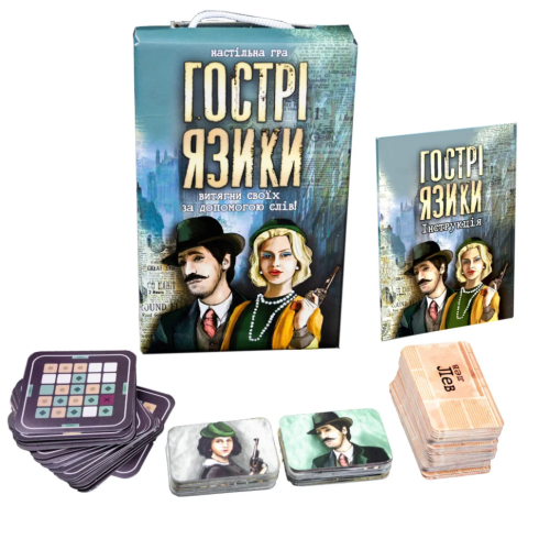 «Острые языки» (30951)– командная словесная игра для любителей шпионского жанра. Вам предстоит вытащить товарищей устанавливая контакт между участниками своей команды. Как это происходит? В начале игры раскладывается сетка из слов, капитаны получают к ней ключ (только они видят слова, принадлежащие каждой из команд). Затем начинается самое интересное – капитану нужно дать наводку своим игрокам, чтобы они разгадали только свои слова, для этого он говорит ассоциацию (одно слово) и цифру, которая обозначает сколько слов из сетки подходят под ассоциацию. Угадывая, игроки команды могут наткнуться на своё слово или соперников, а могут попасть на констебля и тогда игра заканчивается. Побеждает команда, угадавшая все слова из сетки. Капитаны должны выбирать себе в команду тех, с кем они точно на одной волне. Нельзя отвлекаться, ведь предыдущая ассоциация может помочь разгадать новые слова. Дизайн игры как нельзя лучше соответствует шпионской теме, поэтому погрузитесь с головой в игру и забудьте о реальности на какое-то мгновение. «Острые языки» – это настоящая тренировка проницательности, игра учит видеть людей насквозь и понимать даже самые малейшие намеки и подсказки.