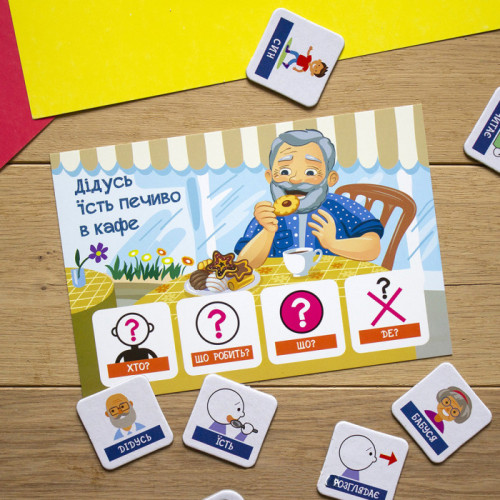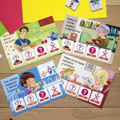 30 карточек, инструкция, коробка. 6 карточек 200х140 мм, 24 карточки 45х45 мм.