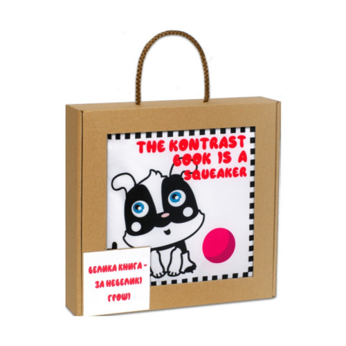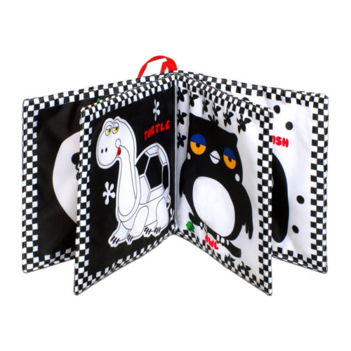 Контрастные черно-белые изображения специально подобраны для развития зрения малышей с первых дней жизни. Книга изготовлена ​​из мягких, приятных на ощупь материалов, безопасных для малыша. Встроенная пищалка привлекает внимание и стимулирует слух.
