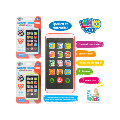Компактный игрушечный телефон M 3487 – отличный подарок для самого маленького, любознательного ребенка старше 12-ти месяцев. Если Ваш непоседа срочно требует приобрести ему такой же смартфон, как у мамы или папы, то такой вариант станет для него настоящей находкой. С помощью замечательного телефончика, Ваш кроха будет развивать полезные навыки, учить стишки, новые слова, фразы, песенки, и даже различать звуки животного мира. Игрушечный сотовый озвучивает три песни, имеет стандартные звуки звонка, звуки зверушек, и воспроизводит 10 стихотворений про животных. Играя с телефоном, Ваш ребенок также научится различать оттенки, звуки, тренировать мелкую моторику, внимательность, ассоциативное и логическое мышление. Интерактивная игрушка-телефон на украинском и английском языках оформлена в приятной, красочной гамме, и отличается детализированным, стильным дизайном, который сделает игру максимально реалистичной.