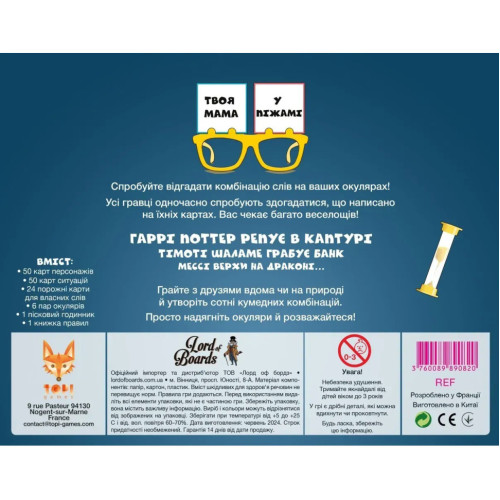 В коробке вас ждёт всё необходимое, чтобы сделать любую вечеринку легендарной: шесть пар цветных очков, которые превратят вас в звезду вечера; более 100 карточек с персонажами и локациями (и даже пустые карточки, чтобы вы могли придумать что-то настолько странное и особенное, что лучше бы об этом никогда не узнала ваша мама); песочный таймер, чтобы всё происходило быстро, добавляя перца и дополнительного напряжения; и, конечно же, бесконечное количество смеха, неловкости и громких подколов.