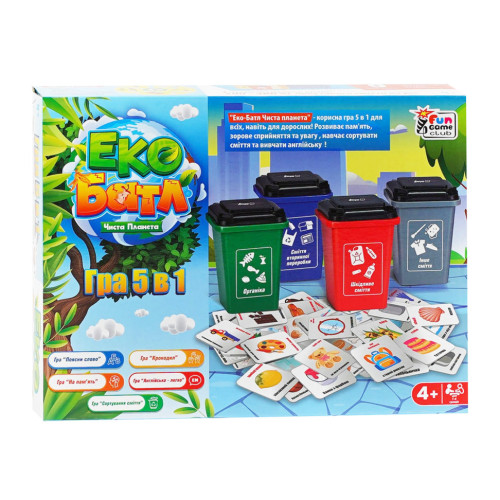 Игровой набор состоит из 4-х цветных мусорных баков, каждый из которых соответствует определенному виду мусора: пластик, бумага, стекло и органические отходы. Каждый мусорный бак имеет яркий цвет и соответствующую маркировку, что помогает ребенку легко определить, куда нужно выбрасывать определенный вид мусора.