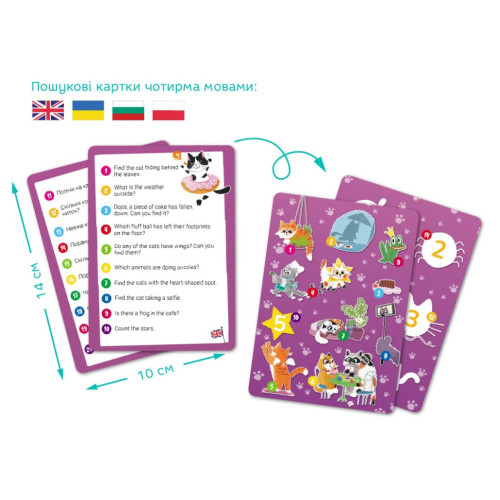2 двусторонние карточки с заданиями (Look & Find) на 4 языках (английский, украинский, польский, немецкий)