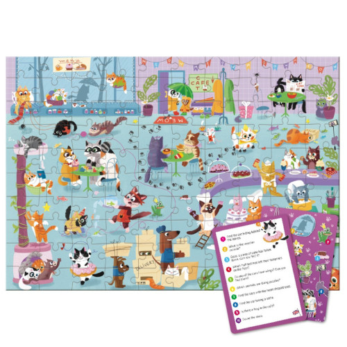 Ищете интересный и развивающий пазл для детей? Подарите малышу настоящее новогоднее приключение с пазлом "Look & Find Кошачье кафе" от бренда Dodo! Этот развивающий пазл на 100 элементов сочетает сборку с веселой игрой на внимательность: после завершения картинки ребенок должен найти спрятанные объекты по подсказкам на специальных карточках.