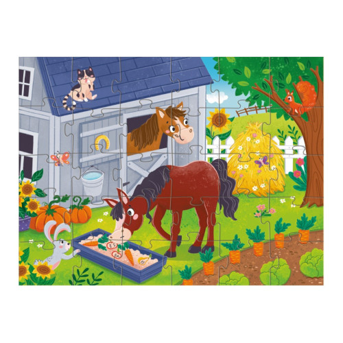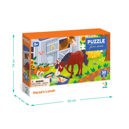 Пазл Dodo "Обед для лошадки" – это яркая развивающая игра для малышей от 3 лет. Складывая 30 крупных деталей, ребенок получит веселую картинку с лошадками на ферме, которые лакомятся морковкой и овощами.