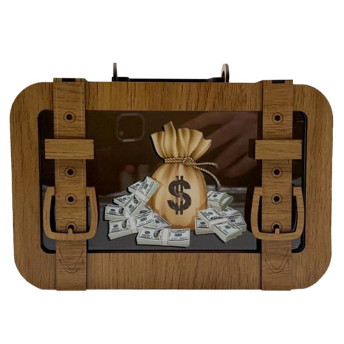Этот стильный и функциональный аксессуар в форме винтажного чемодана, оформленный в ярком дизайне, имитирующем американскую валюту, станет мощным мотиватором для достижения финансовой цели.