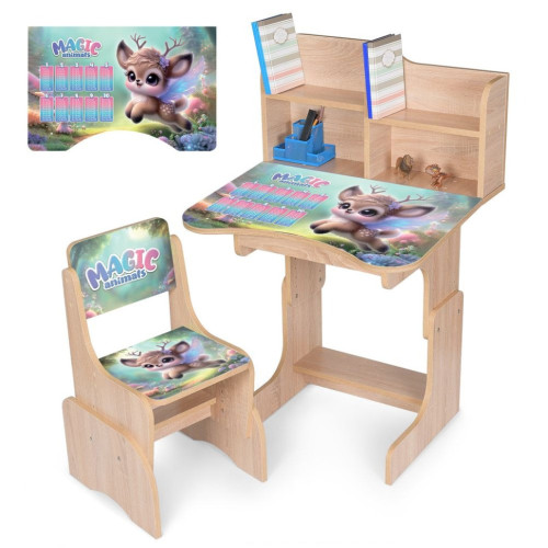 Парта N 2071 идеальное решение для маленьких школьников и дошкольников. Комплект включает компактный деревянный стульчик с тремя уровнями регулировки высоты, что обеспечивает правильную посадку ребенка на разных этапах роста. На парте изображена украинская азбука, что способствует легкому изучению букв во время занятий.