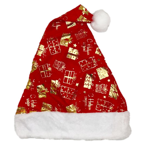 Шапка Деда Мороза с белой окантовкой изготовлена из мягкого материала и украшена блестящими золотыми узорами, придающими изделию праздничный вид. Красный фон создает яркий акцент, а пушистый белый помпон завершает образ. Объем шапки 58 см, длина 44 см — подходит для взрослых. Легкая, удобная и эффектная, она прекрасно дополнит новогодний образ, корпоратив или праздничную фотосессию.