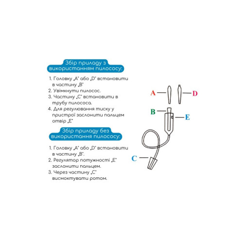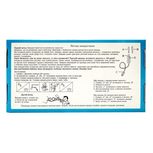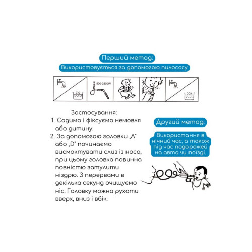 С помощью головки "А" или "D" начинаем высасывать слизь из носа, при этом головка должна полностью заслонить ноздрю. С перерывами в несколько секунд очищаем нос. Головку можно двигать вверх, вниз и в сторону.