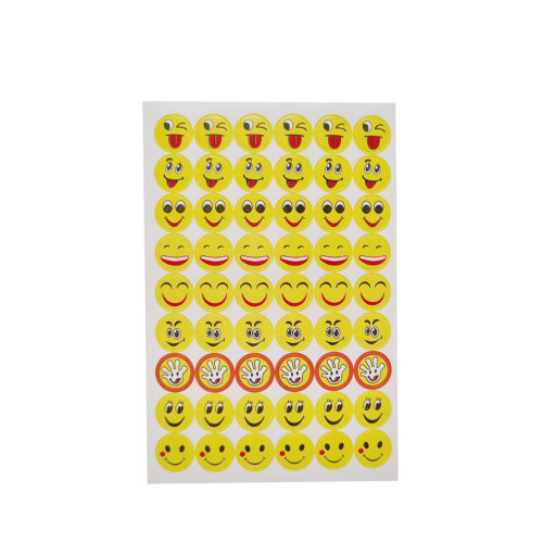 Каждая наклейка имеет круглый формат. На каждой из них изображен смайлик, отражающий определенное эмоциональное состояние, а именно: радость, удовольствие, средний уровень, не удовлетворенный и неудовлетворительный. Каждый смайлик имеет свой уникальный цвет, позволяющий легко выделить определенный уровень успеваемости или состояние удовольствия.