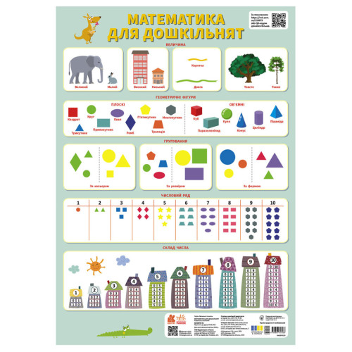 Учебный плакат «Математика для дошкольников» способствует овладению детьми основных математических понятий, например: величина, формы, геометрические фигуры, группировка фигур по определенным признакам, числовой ряд, состав числа. Наглядность поможет детям лучше запомнить материал и хорошо подготовиться к школе. А QR-код, имеющийся на плакате, позволит узнать больше интересной познавательной информации.