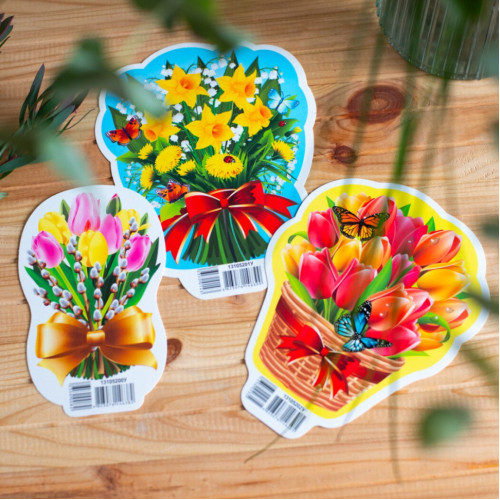 В набор входят 3 букета цветов и 1 цветок в горшке, изображения которых вырезаны на картоне. Каждый букет имеет основу, которую можно вставить, чтобы композиция стояла самостоятельно.