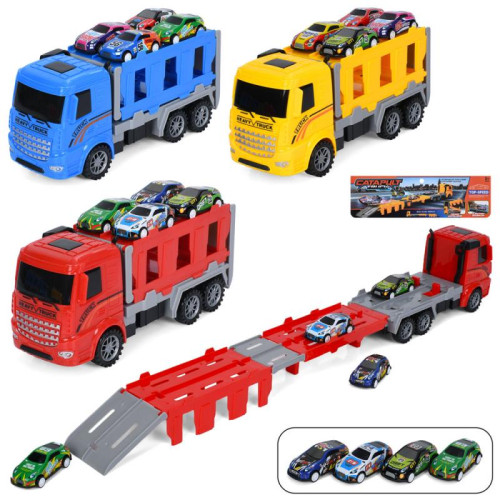 Трейлер інерція, 24см, 2в1 (трек, 65см, запуск), машинка 7см, 4шт, мікс видів, у пакеті, 24-20-8см , 2090