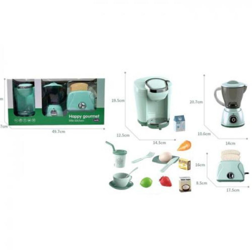 Набір побутової техніки кавоварка 19,5см-ллється вода, блендер 20,5см, тостер 15,5см-механічний, посуд, продукти, звук, світло, на бат-ц, A1008-5