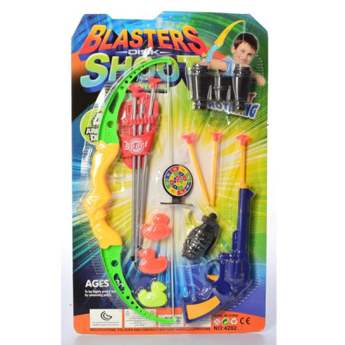 Лук 41см, стріли-присоски 3шт, сагайдак, пістолет 22см, бінокль, мішень та 3 качечки в наборі.