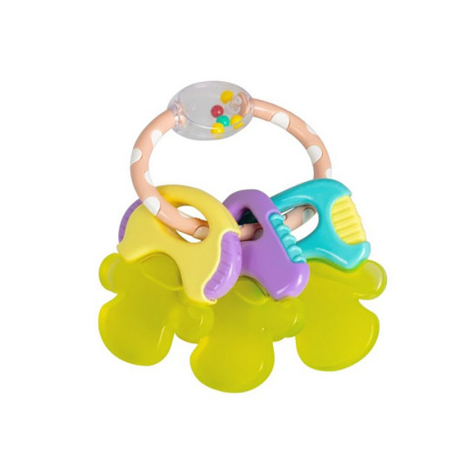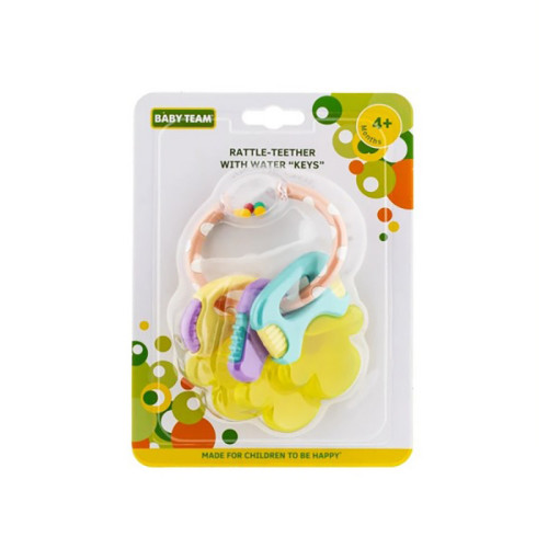 BABY TEAM Погремушка-прорезыватель имеет три элемента в виде ключиков с водой, соединенных между собой кольцом. Благодаря интересной эргономичной форме игрушку удобно и комфортно держать в маленьких детских ручках. Перед тем как дать погремушку-прорезыватель ребенку, необходимо его охладить в течение 2-3 минут в холодильнике.