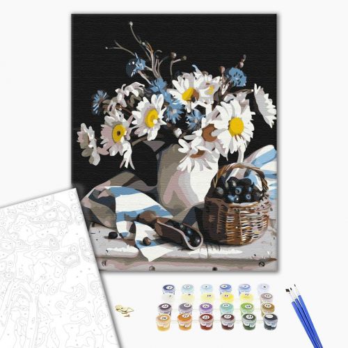 Комплектация: Холст на подрамнике с галерейной натяжкой, бумажная инструкция с контурным рисунком картины, нейлоновые кисти, палитра акриловых красок в контейнерах, крепление