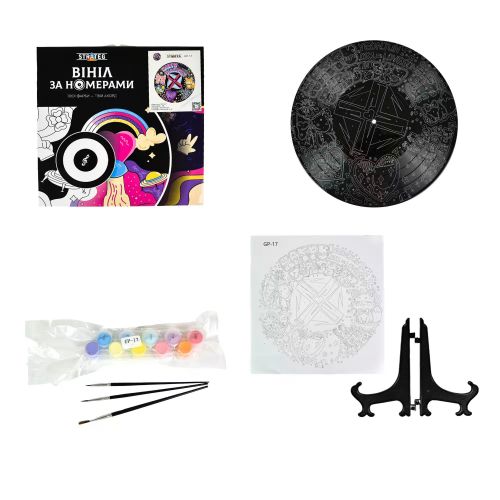 Комплектация: виниловая пластинка с пронумерованными контурами; контрольный лист; акриловые краски в пронумерованных контейнерах; 3 кисти разной толщины из нейлонового волокна; пластиковая подставка.