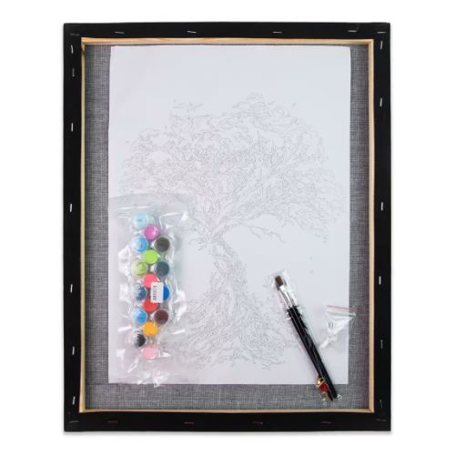 Комплектация: Полотно на подрамнике с галерейной натяжкой, бумажная инструкция с контурным рисунком картины, кисти нейлоновые, палитра акриловых красок в контейнерах
