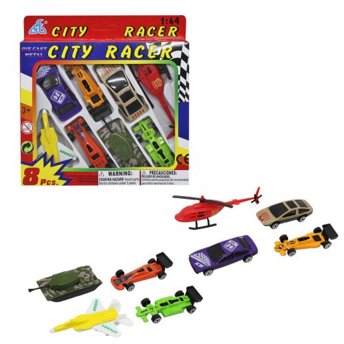 Набор из восьми транспортных средств обязательно порадует ребенка. В наборе есть самолет, 3 гоночные машинки, танк, легковая машина, спортивная машина и вертолет. Набор выполнен из качественных и безопасных материалов, для детей от 3-х лет.