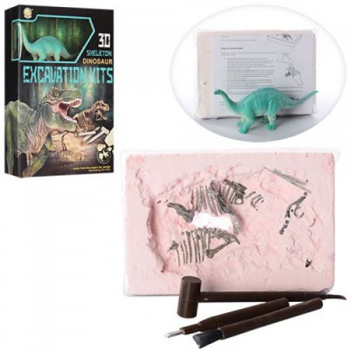 Комплектация: 1 фигурка динозавра, 1 стамеска, 1 кисточка, 1 молоток с наконечником, 1 гипсовая форма с костями динозавра, инструкция