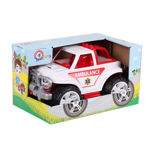 Машинка "Скорая ТехноК". Внедорожник с открытым кузовом, массивными бамперами и большими колесами. Оптимальные размеры для использования как в комнате так и для игры на улице.