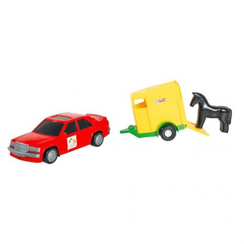 Яркая, пластиковая машинка с прицепом. В комплекте с машинкой есть лошадка. Размер машинки - 27х9 см., прицепа - 17х14 см., диаметр колес - 4 см. Выполнена из качественного пластика. Есть разные цвета в ассортименте. Для детей от 3-х лет._