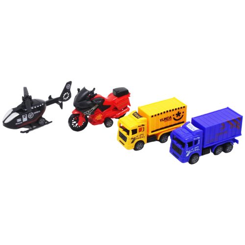 Набор пластиковых машинок из серии "Логистический транспорт". В комплект входит: 2 грузовика, вертолет и мотоцикл. Транспорт инерционный. Размер машинок от 11 до 14 см.