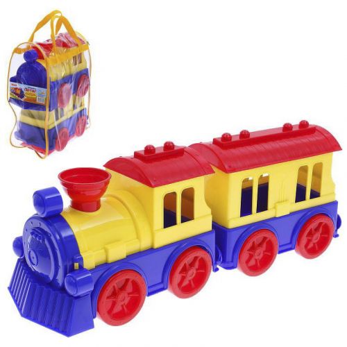 Большой и яркий пластиковый поезд с вагоном. И в кабину машиниста и в вагон можно поставить маленькие фигурки. Длина в собраном виде - 62 х 17 х 22 см._