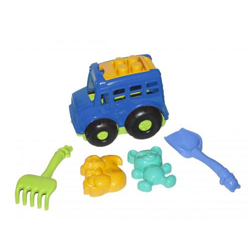 Машинка (автобус) бусик с песочным набором. Две пасочки в форме животных, лопатка и грабельки.