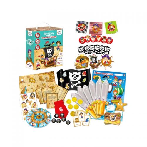 Яркий и увлекательный Party Box. Внутри коробки - увлекательный квест, который станет замечательным вариантом проведения Дня Рождения маленького пирата. Предназначен для 6-ти детей, возрастом от 5 до 9 лет. Длится квест примерно 1,5 часа. В наборе есть всё необходимое для проведения квеста: инструкция, сценарий, приглашения (5 шт), карта сокровищ, пиратский флаг, наклейки (34 шт), пиратские письма (6 шт), мешочек, пиастры (6 шт), карточки гостей (6 шт), конверт, кортики (6 шт), стакан, камушки-украшения для кортиков (30 шт), шифр, скрижаль поиска, чёрные метки (8 шт), плакат для пожеланий, алмаз дракона, пластиковый стакан, этикетка на бутылку, игра "Колесо фортуны", карточная игра "Крокодил" (29 карт), флажки (6 шт), украшения для комнаты (9 шт), верёвка (5,5 м).