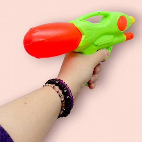 Пластиковый водный пистолет небольшого размера. Чтобы пистолет стрелял, нужно заполнить водой специальный отсек. Размер пистолета – 26х13х5 см. Прекрасно подойдет для активного отдыха на улице. Выполнены из качественных и безопасных материалов. Для детей старше трех лет.