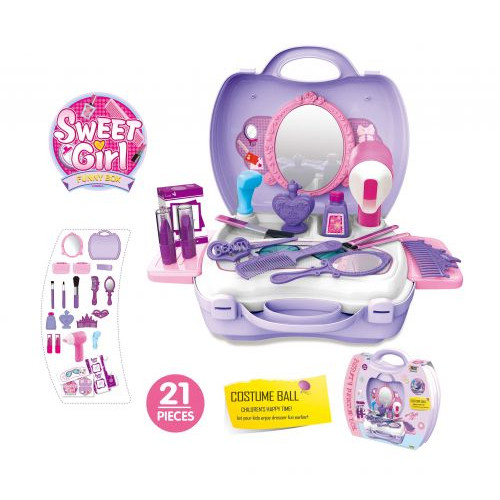 Комплектация: Чемоданчик, столик с полочками, фен, душ, 2 помадки, коробочка, расчёска, зеркальце, 3 кисточки для макияжа, гребень, 2 флакончика духов, заколочка