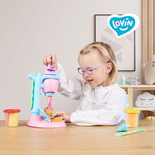 Набор для лепки с воздушными тестом "Ice Сream Сafe". В наборе есть 3 стаканчика с тестом (по 3 цвета теста в каждом стаканчике), а главной фишкой набора является пластиковая машина для изготовления мороженого и 8 насадок для нее, при помощи которых ребенок сможет создать более 100 возможных комбинаций форм и цветов и десерта. На основе машинки есть 10 молдов, при помощи которых можно создать оригинальные украшения для мороженого. Для детей от 3-х лет._