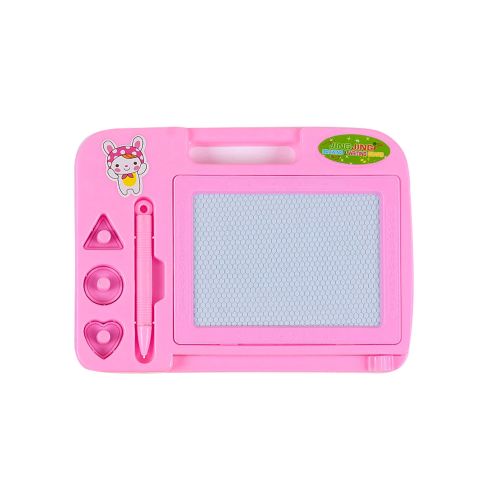 Яркая пластиковая доска для рисования. Имеет магнитную основу. В наборе: магнитная ручка и 3 печати (в форме треугольника, круга и сердечка). Готовый рисунок можно стереть, потянув за бегунок внизу доски.